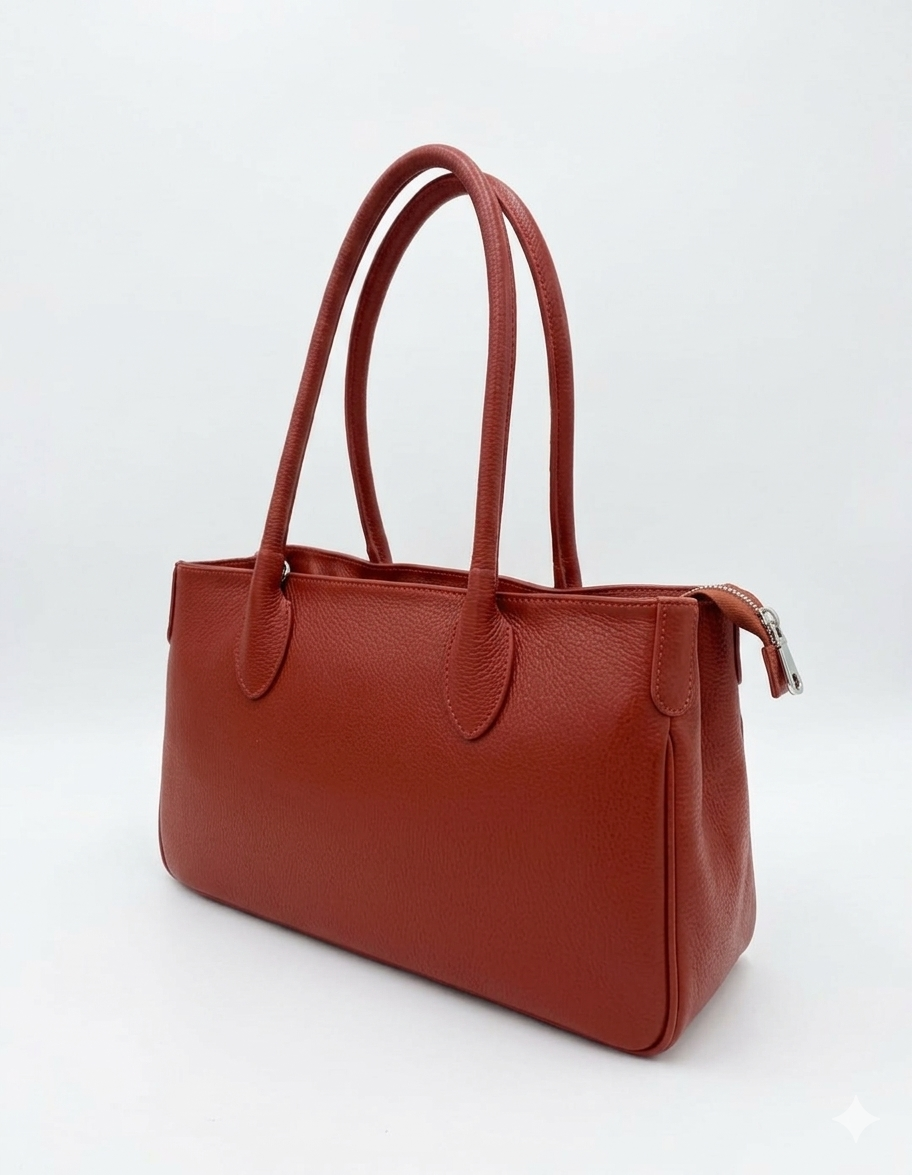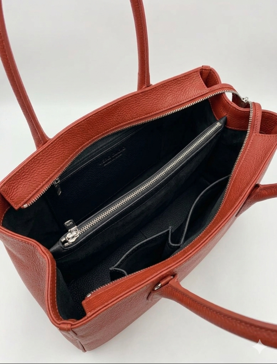 Изискана и практична дамска чанта, създадена от висококачествена естествена кожа тип Dollar, която се отличава със своята мекота, устойчивост и характерна зърнеста текстура. Произведена в Италия – символ на стил, класа и внимание към детайла.