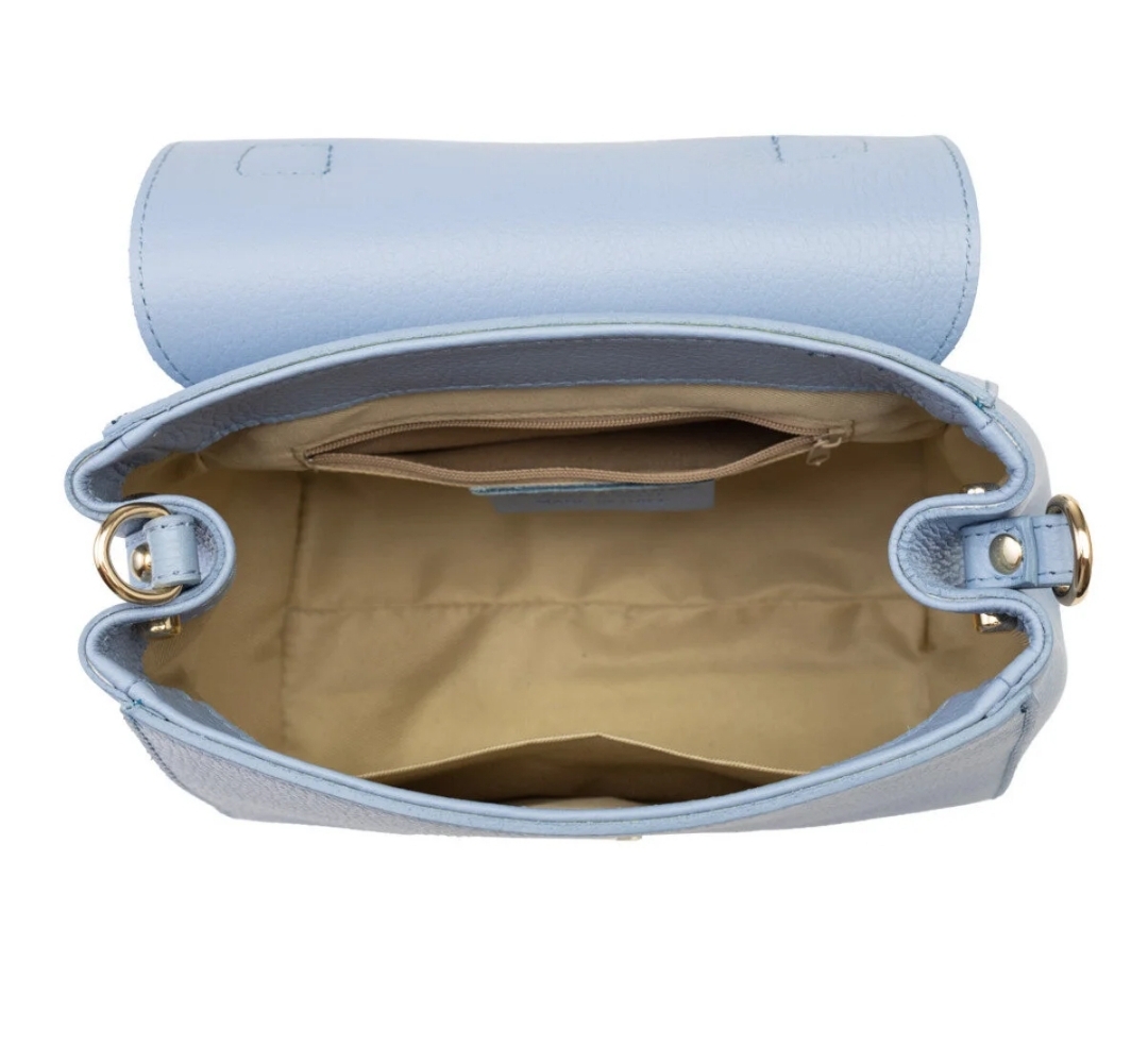 Чантата Carlita е изискан модел, който носи духа на истинската италианска елегантност. Произведена в Италия, тя впечатлява с автентичен стил, внимание към всеки детайл и безкомпромисно качество – отличителни черти на италианската мода. Изработена от висококачествена естествена кожа тип Dollar, чантата се отличава със своята мека текстура и нежен светло син цвят, който придава свежест и финес на визията.