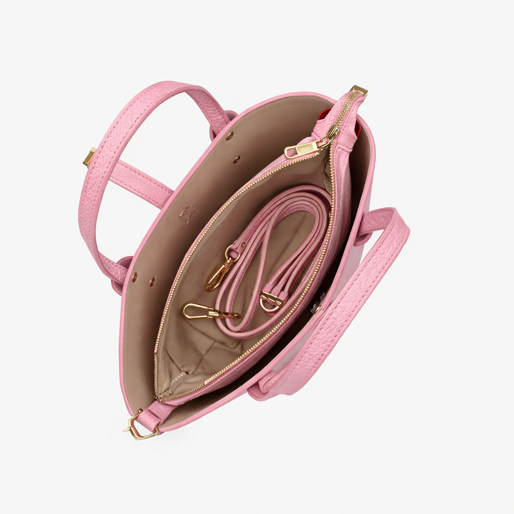 Моделът разполага с едно основно отделение с цип, което осигурява сигурност и удобство при съхранение на най-необходимите вещи. Златистите елементи добавят фин луксозен акцент и подчертават елегантния дизайн.