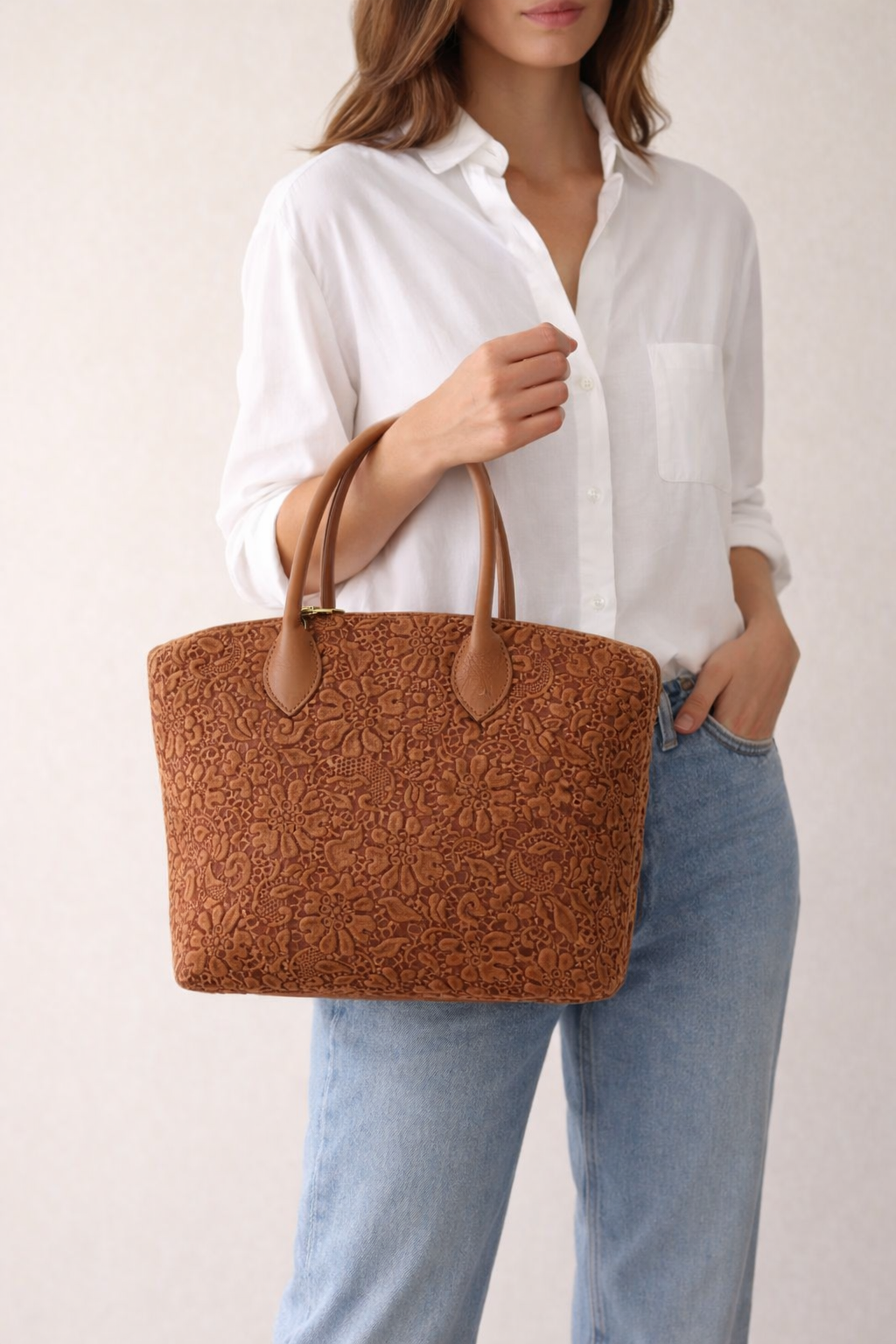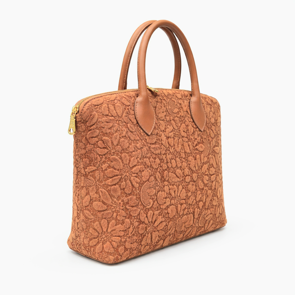 Акцент в дизайна са красивите флорални мотиви, изработени от естествен велур, които придават романтично и женствено излъчване. Чантата разполага с едно просторно основно отделение, допълнено от вътрешно джобче с цип за по-добра организация на личните вещи.