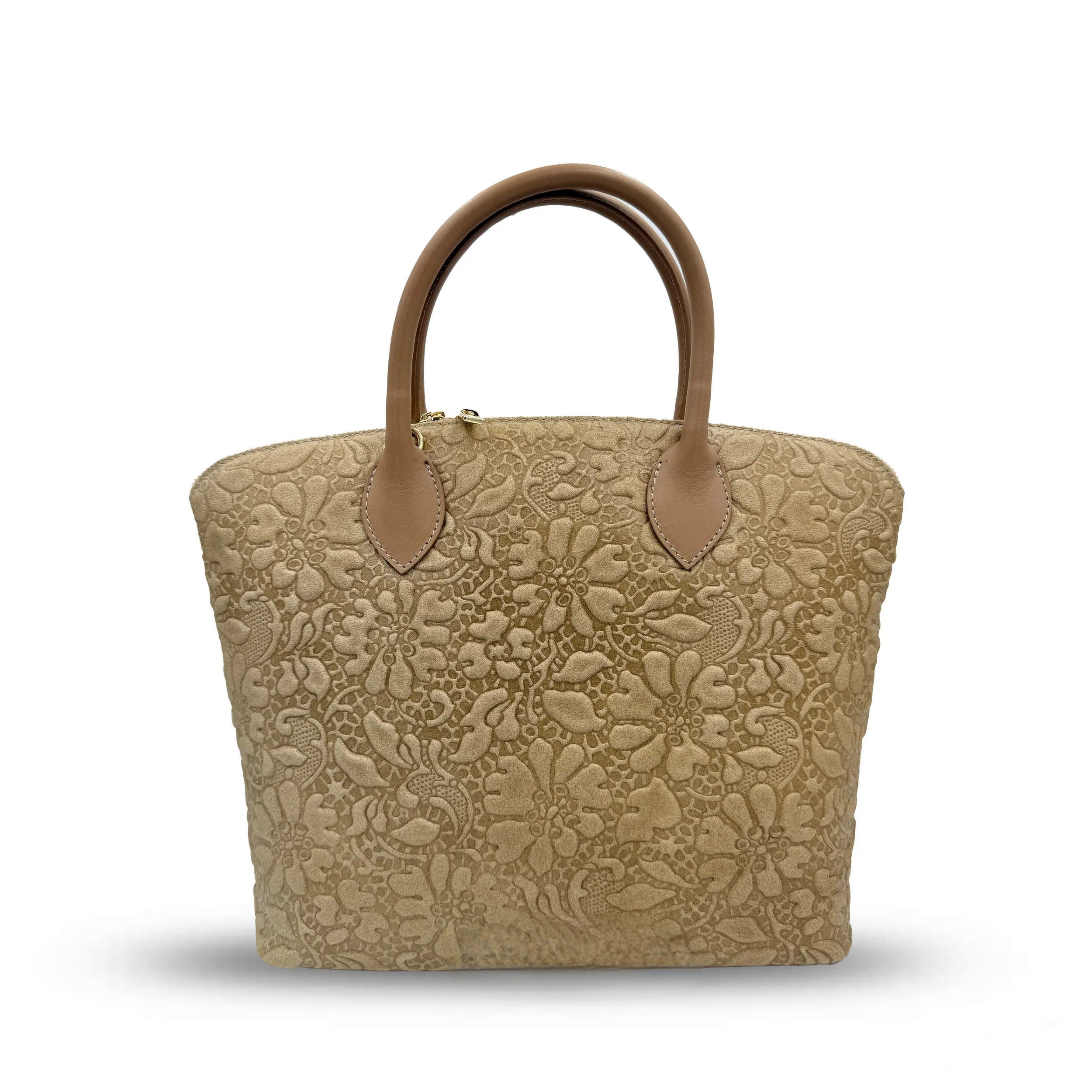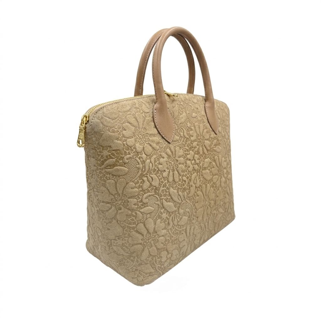 Акцент в дизайна са красивите флорални мотиви, изработени от естествен велур, които придават романтично и женствено излъчване. Чантата разполага с едно просторно основно отделение, допълнено от вътрешно джобче с цип за по-добра организация на личните вещи.