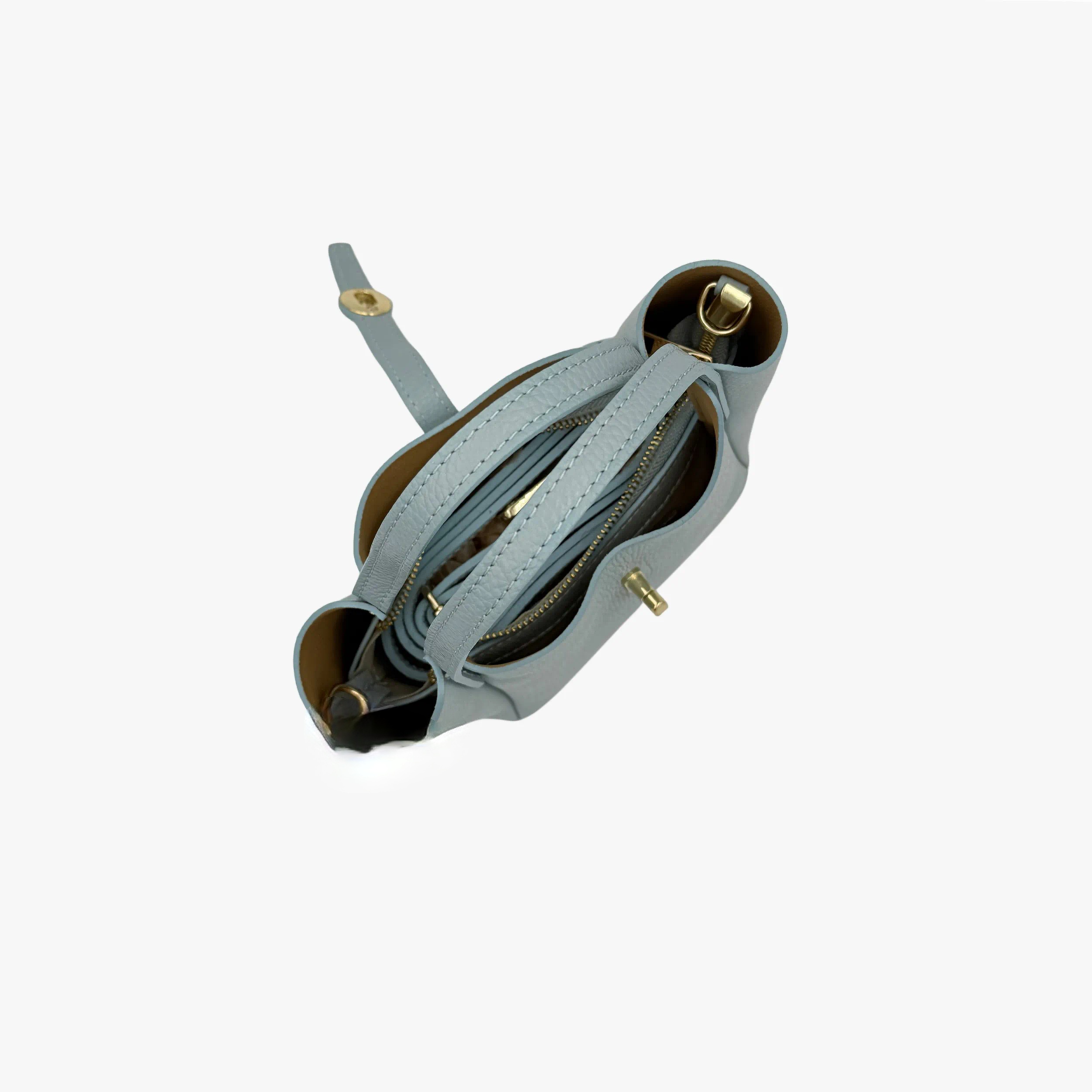 Моделът разполага с едно основно отделение, което осигурява достатъчно пространство за най-необходимите вещи, като същевременно запазва компактната си форма. Закопчаването с цип гарантира сигурност, а фините златисти елементи добавят нотка лукс и изисканост.
