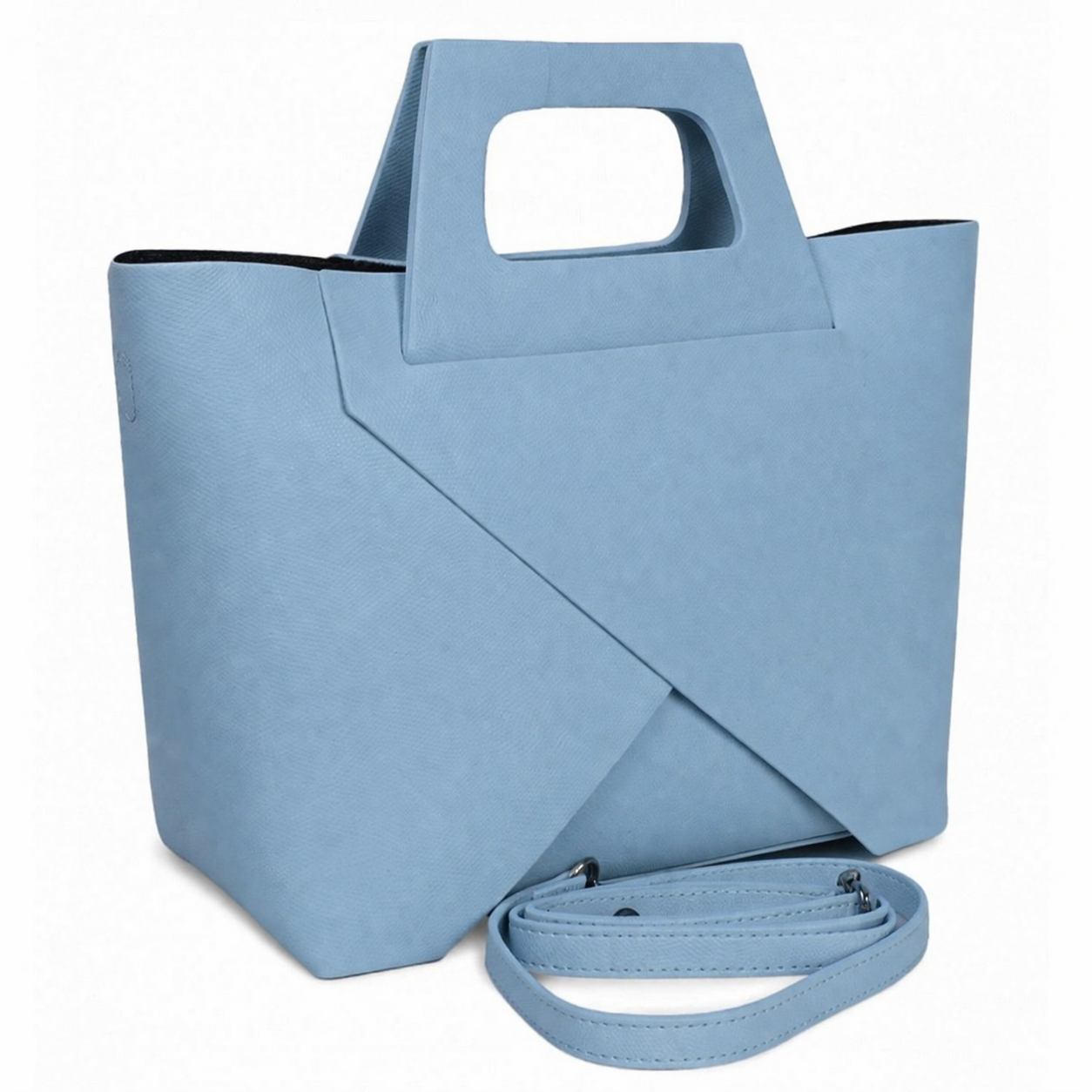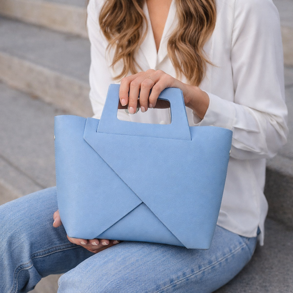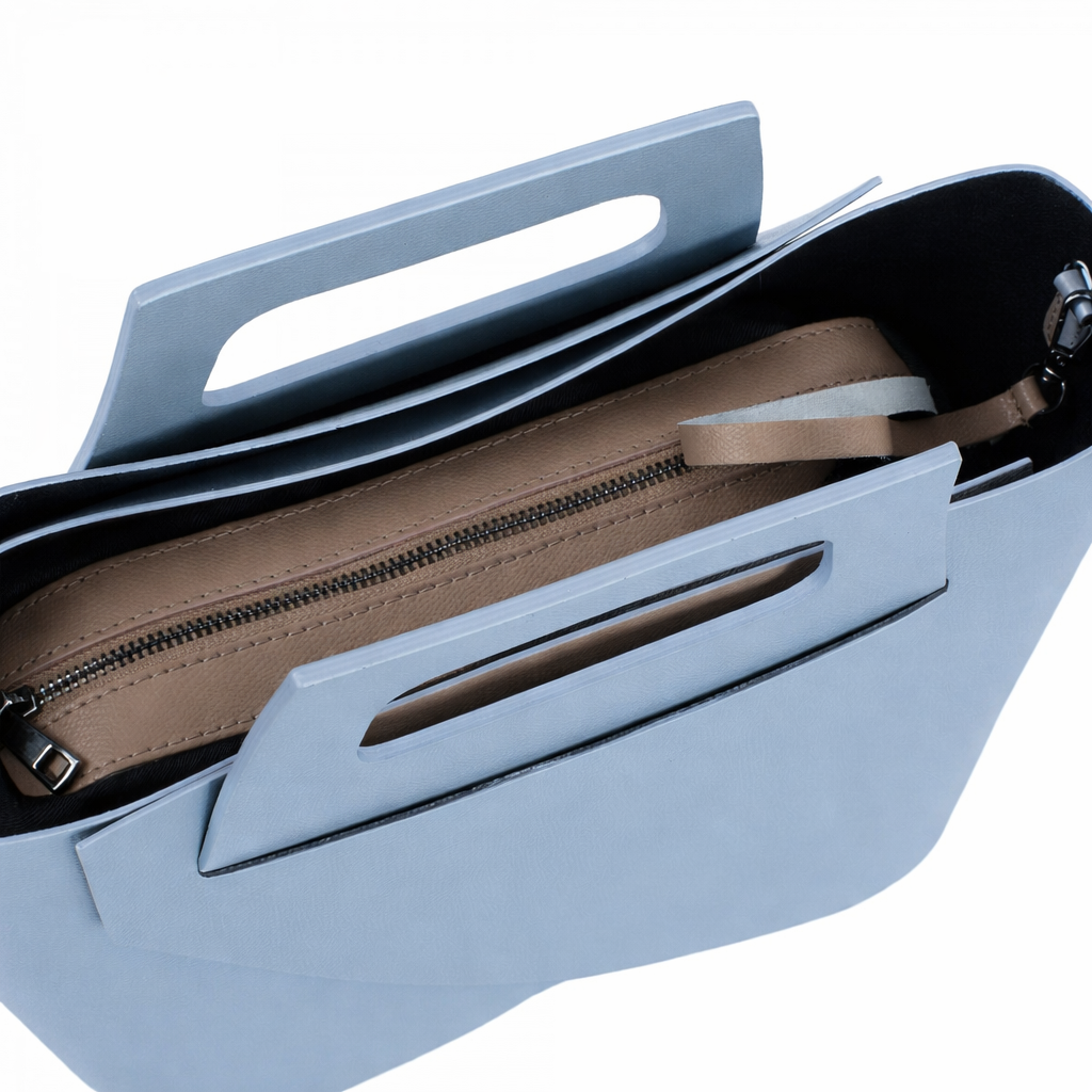 Чантата е снабдена както с къси дръжки за носене в ръка, така и с дълга регулируема дръжка за носене през рамо. Твърдото дъно с метални крачета осигурява стабилност и защита при поставяне върху различни повърхности.