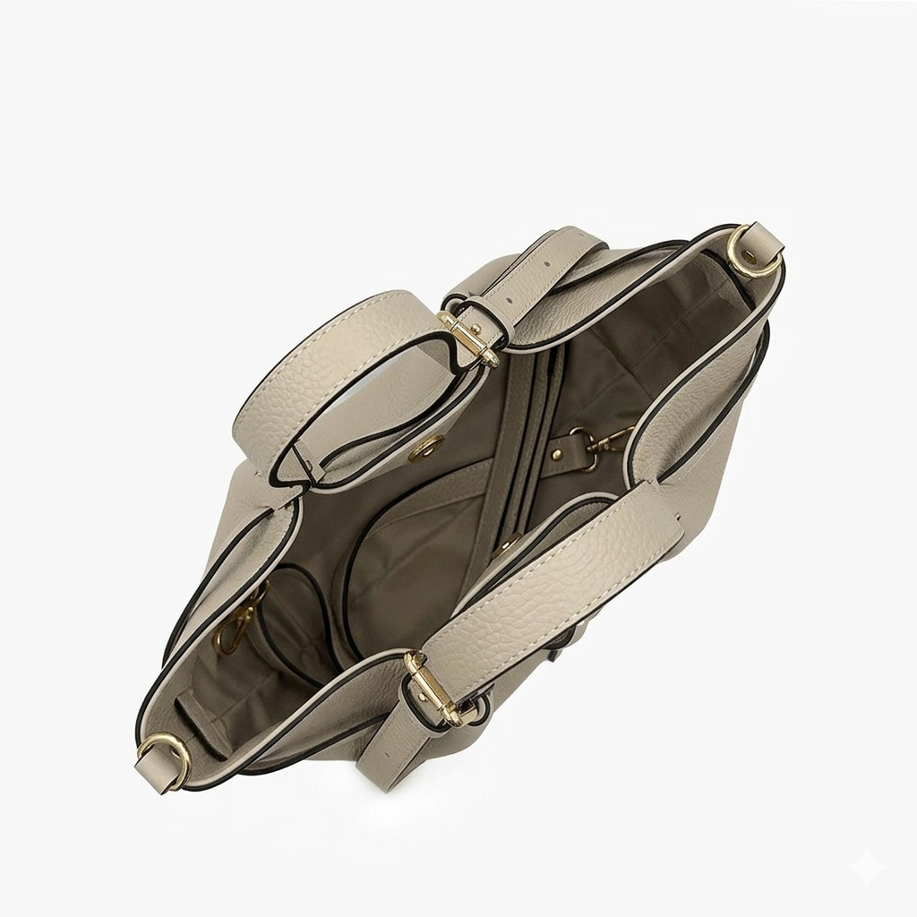 Моделът разполага с едно просторно основно отделение, допълнено от малко вътрешно джобче с цип, което позволява удобно съхранение на по-ценни или дребни вещи. Златистите елементи придават изискан завършек и луксозно излъчване.