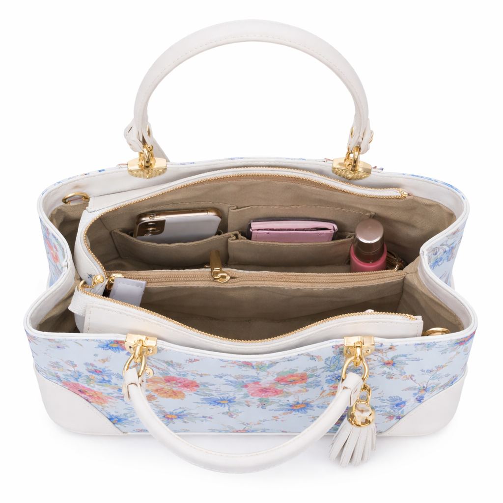 Чантата е с оптимални размери 32 × 24 × 12 см, което я прави идеална както за ежедневието, така и за по-специални поводи. Просторното вътрешно разпределение включва три големи отделения, като едното е с цип за по-голяма сигурност, както и две малки джобчета за аксесоари и допълнително вътрешно джобче с цип.