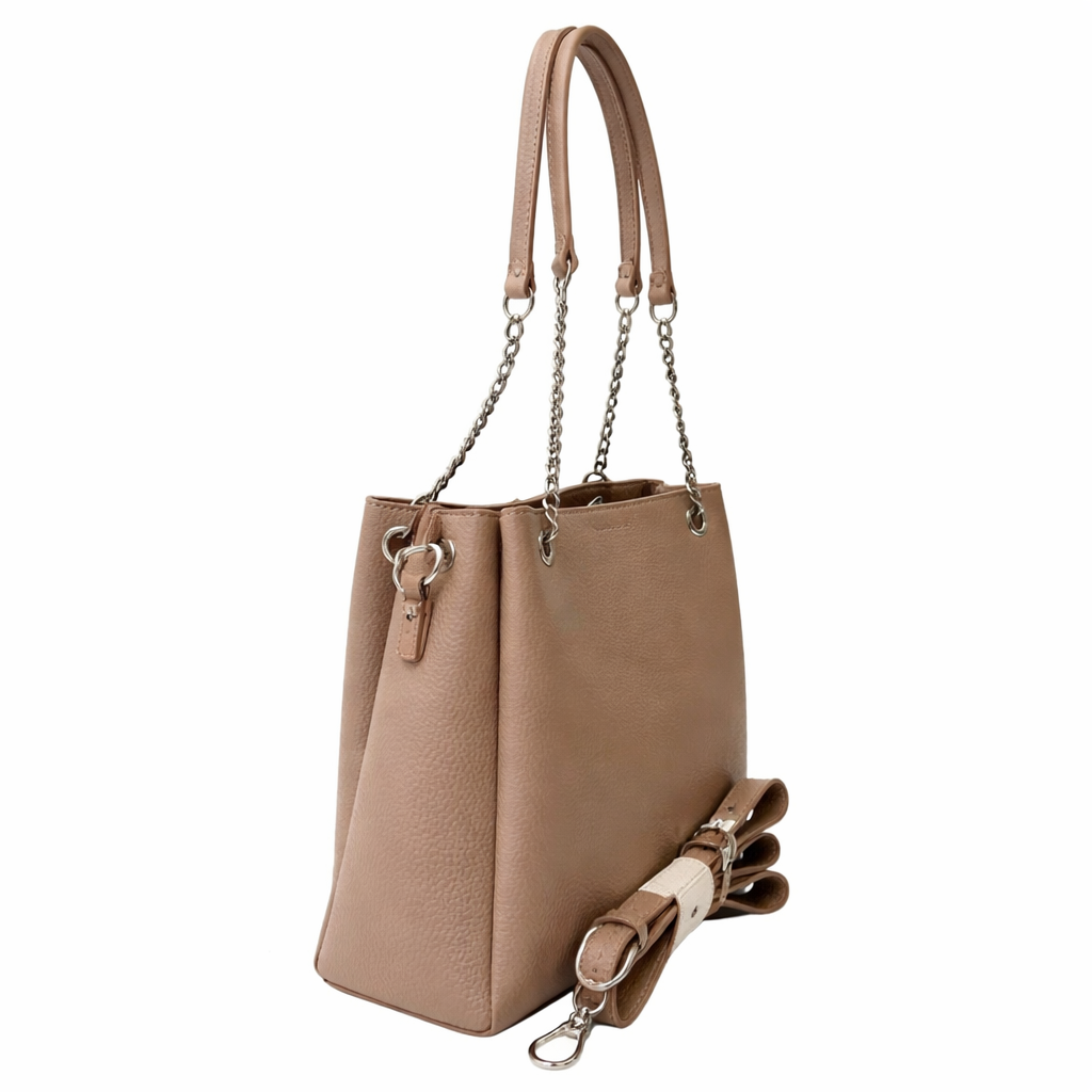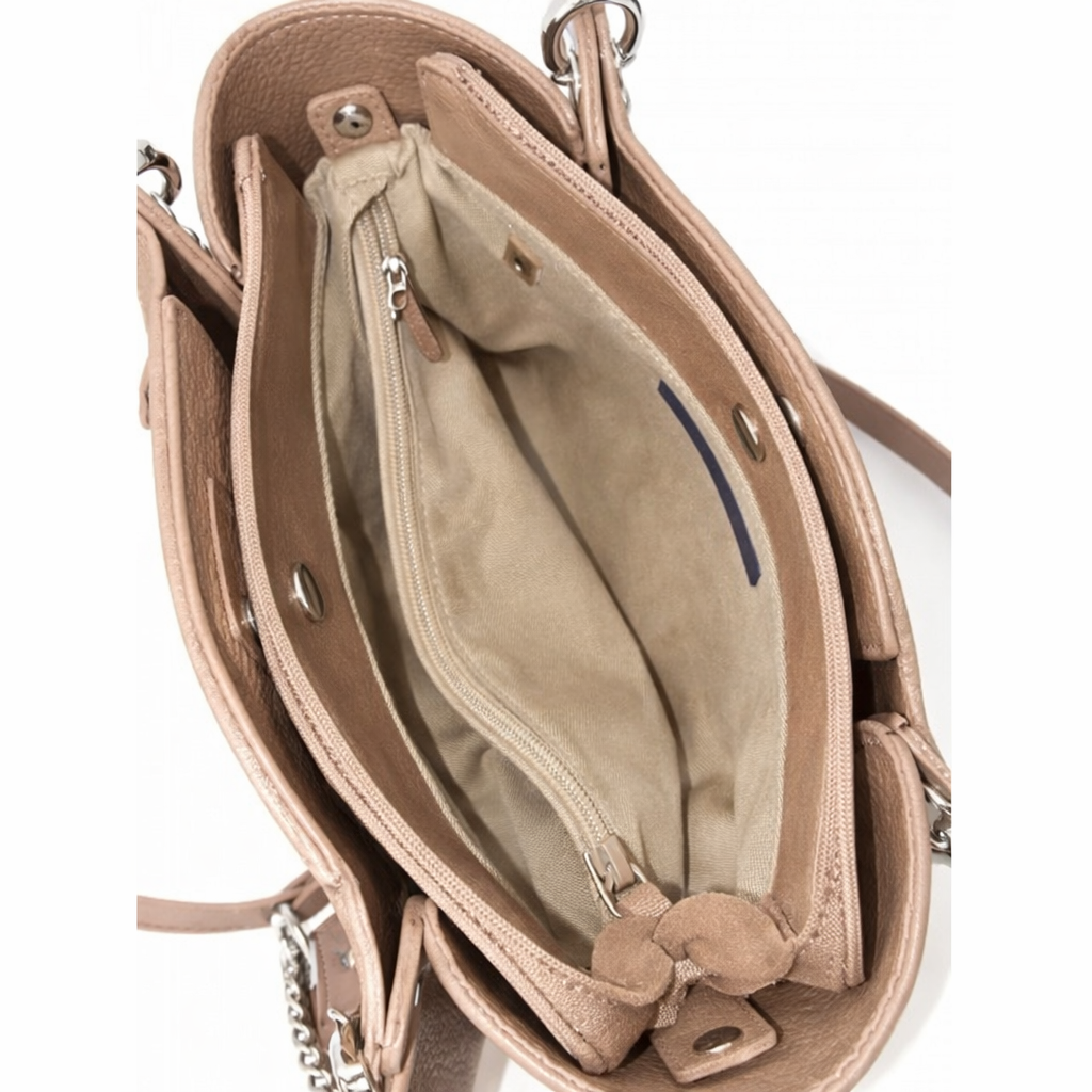 Чантата е снабдена с удобни дръжки за носене на рамо, както и с допълнителна дълга дръжка за по-голямо удобство и гъвкавост. Сребристите елементи придават модерен и завършен вид, подчертавайки елегантността на модела. Patrizia е перфектният избор за дамите, които търсят практична, добре организирана и стилна чанта с характер.