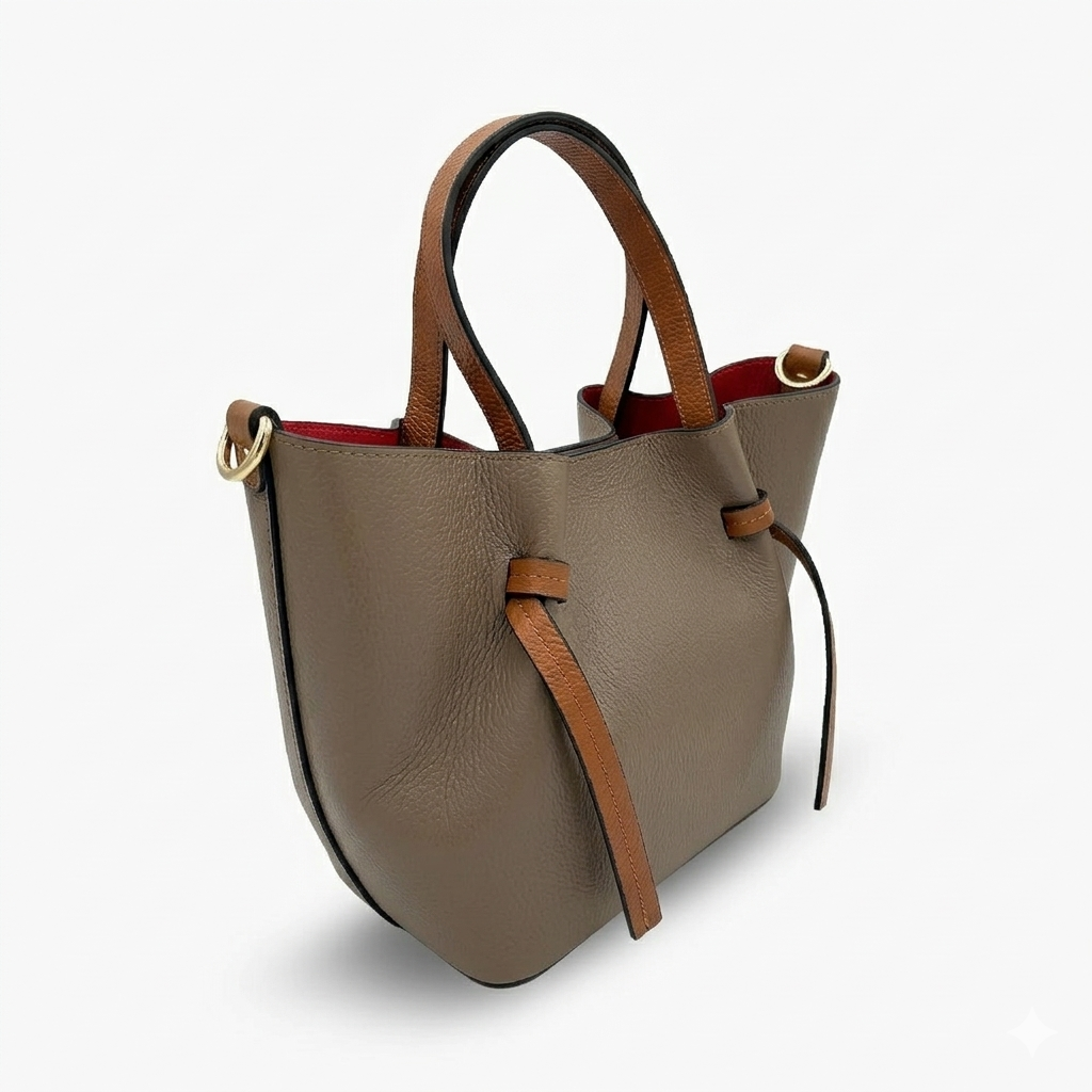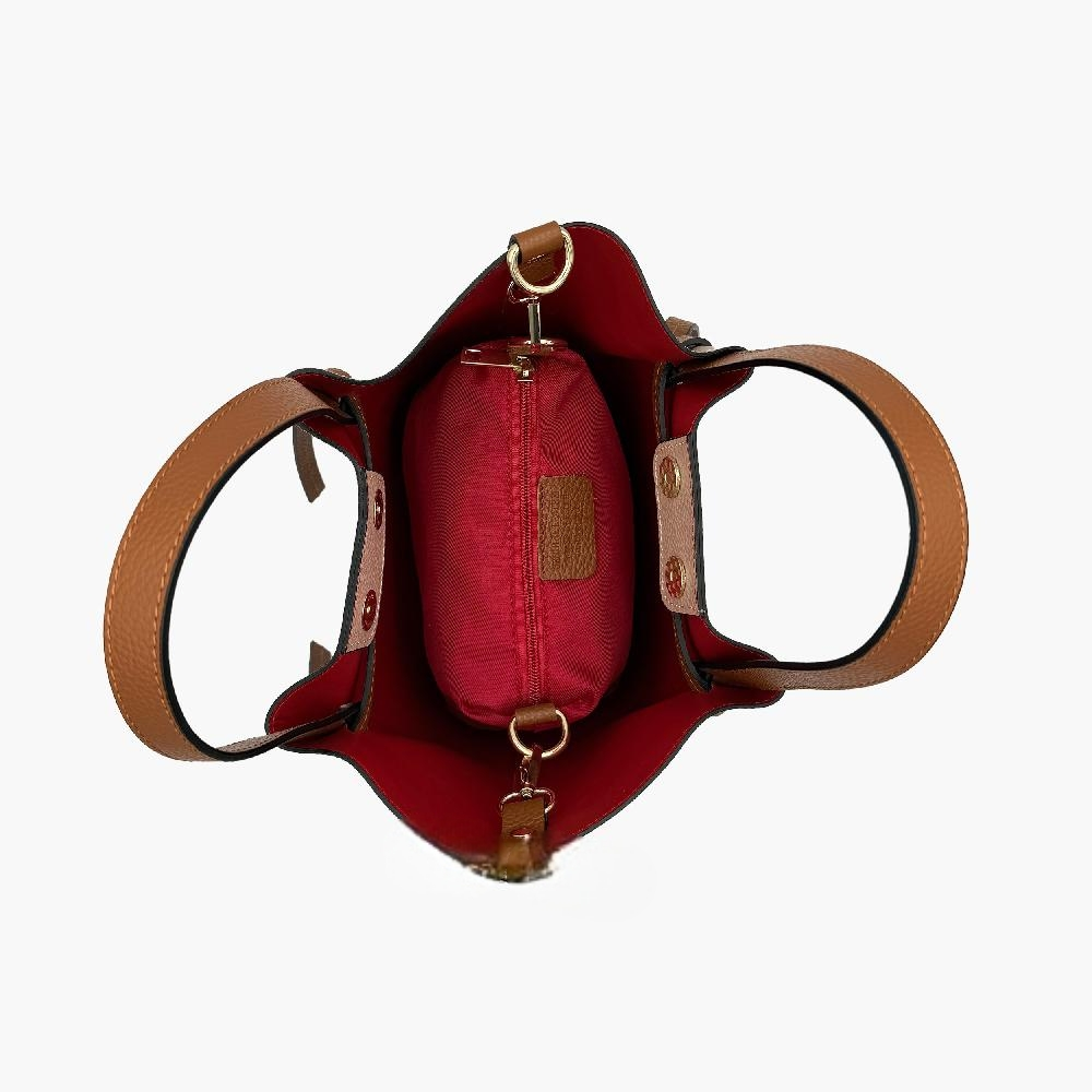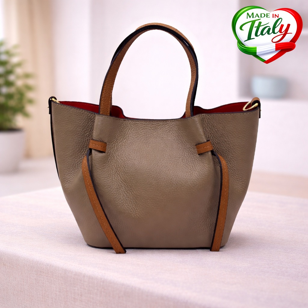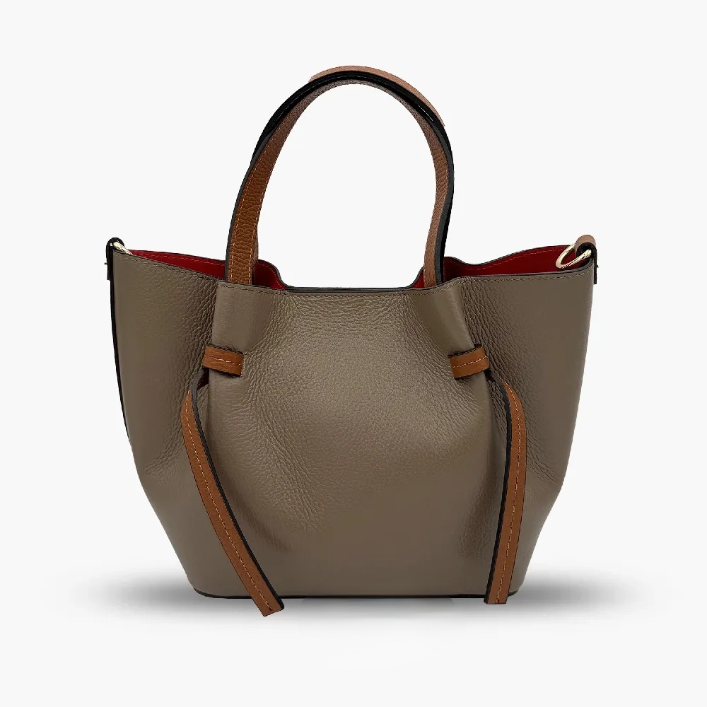 Елегантна дамска чанта, изработена от висококачествена италианска естествена кожа тип Dollar. Моделът се предлага в модерен цвят пудра,таупе и тъмно кафяв, с контрастна червена вътрешност, която придава стилен акцент. Чантата е със среден размер и удобни дръжки, а допълнителната дълга дръжка позволява носене и през рамо. В комплекта е включен и практичен вътрешен несесер.