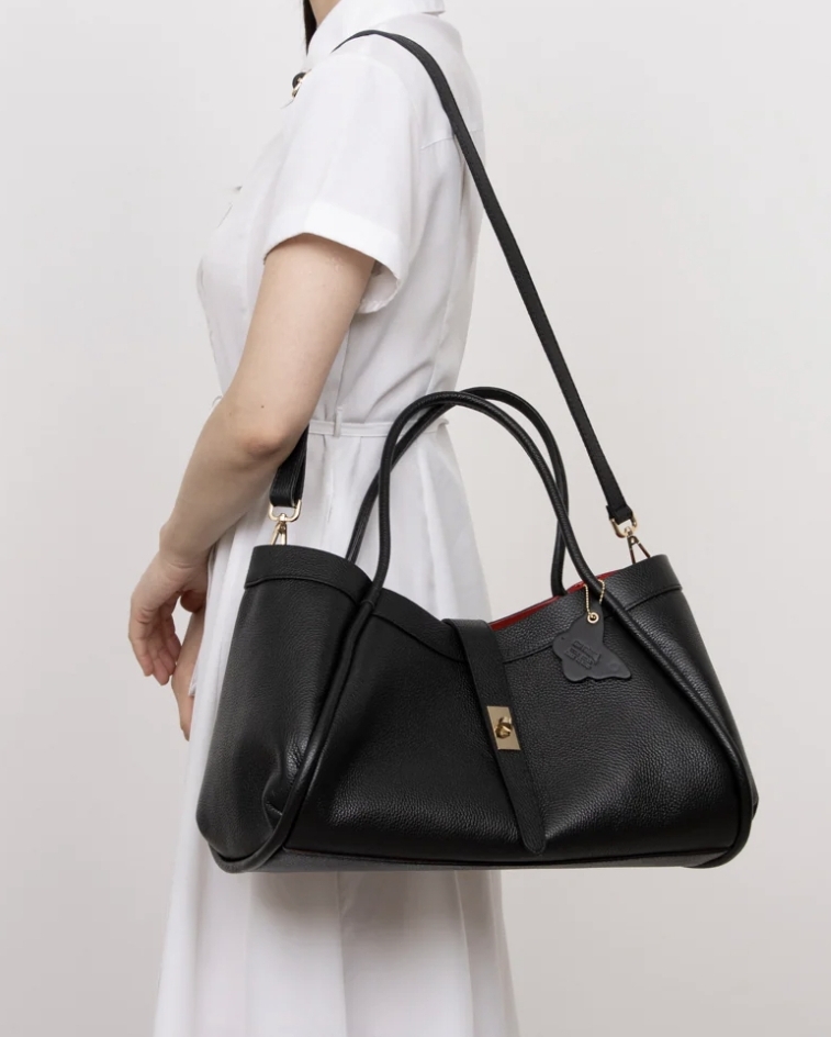 Чантата се предлага  в три цвята: черен, кафяв и бежов.